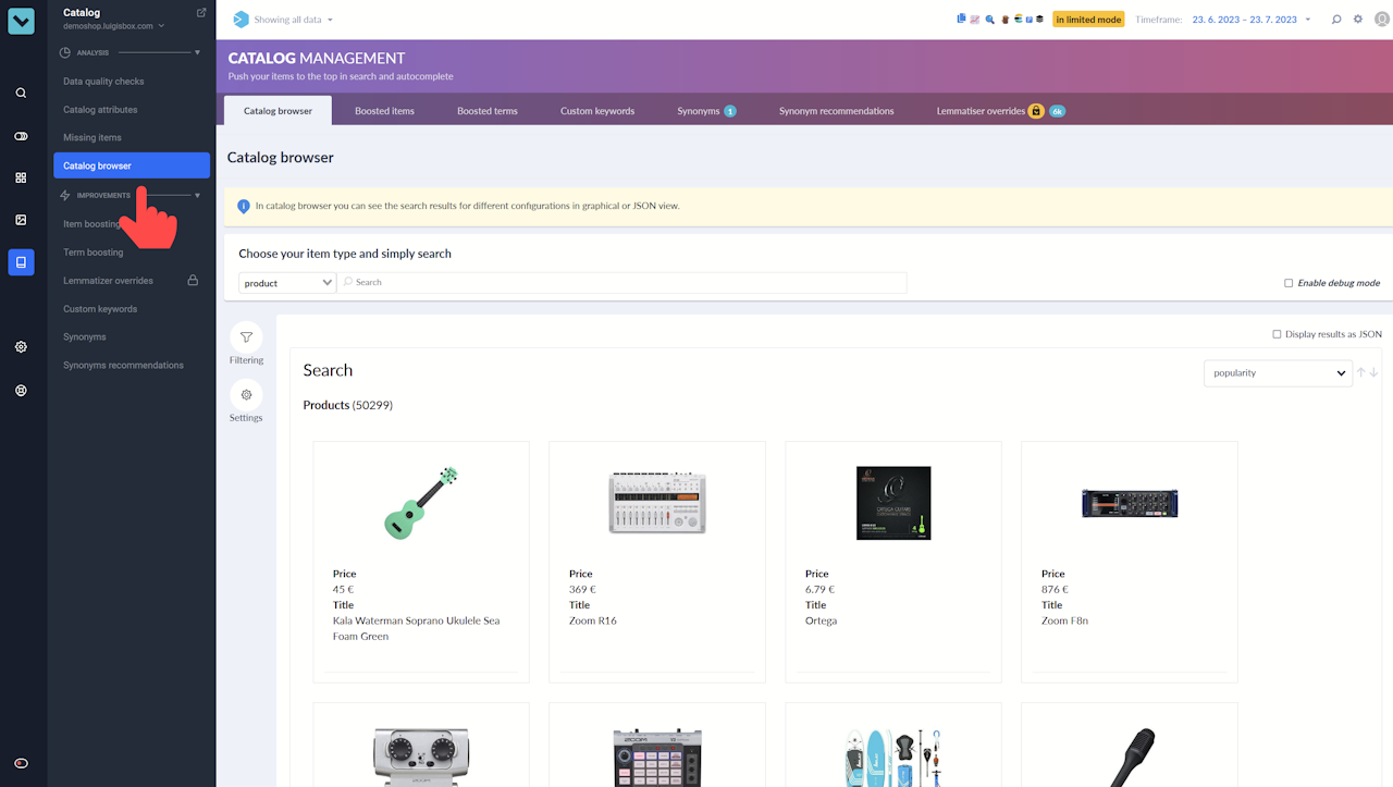 Catalog browser is a debug mode, where you can find all indexed items from your catalog and preview all internal attributes. In catalog browser you can see the search results for different configurations in graphical or JSON view.