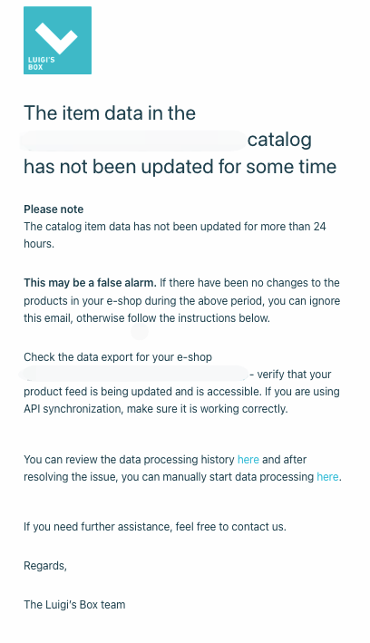 If you received an email notification saying that the catalog item data hasn’t been updated for a certain period, please note that this message is only to inform you that no data changes have been detected during the last update window (typically 24 hours, depending on your project’s settings).
