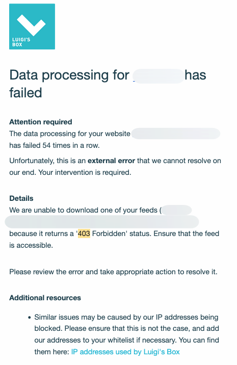 We attempted to download your feed or access your API endpoint, but your server responded that we are not authorized to do so.