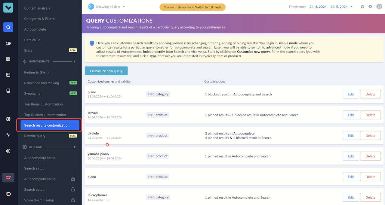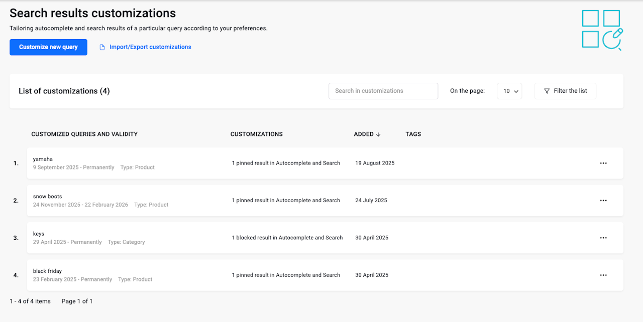 When a client enters a specific query, the search results, both in autocomplete and search, align with the list you've crafted using the Search results customization feature.
